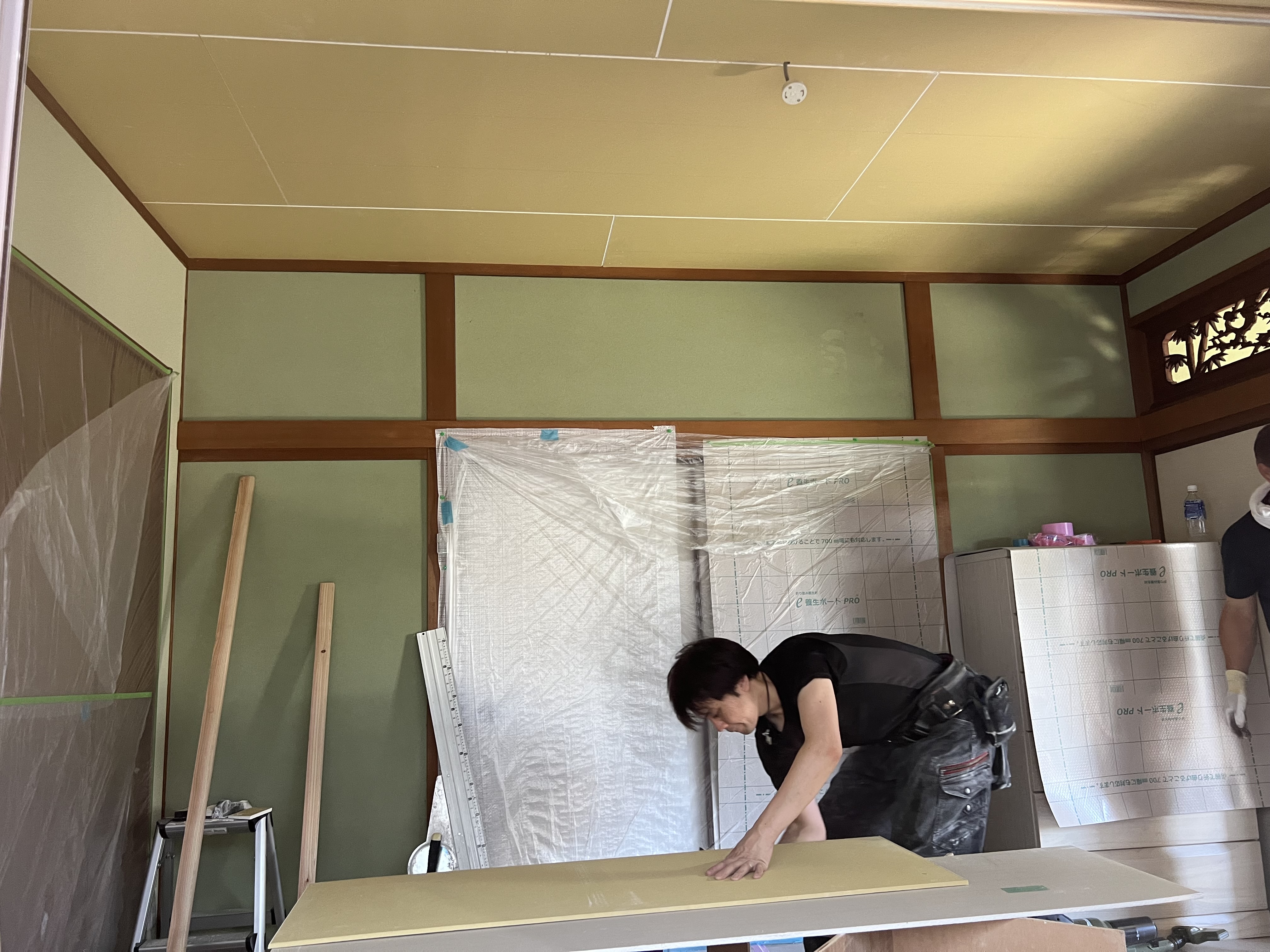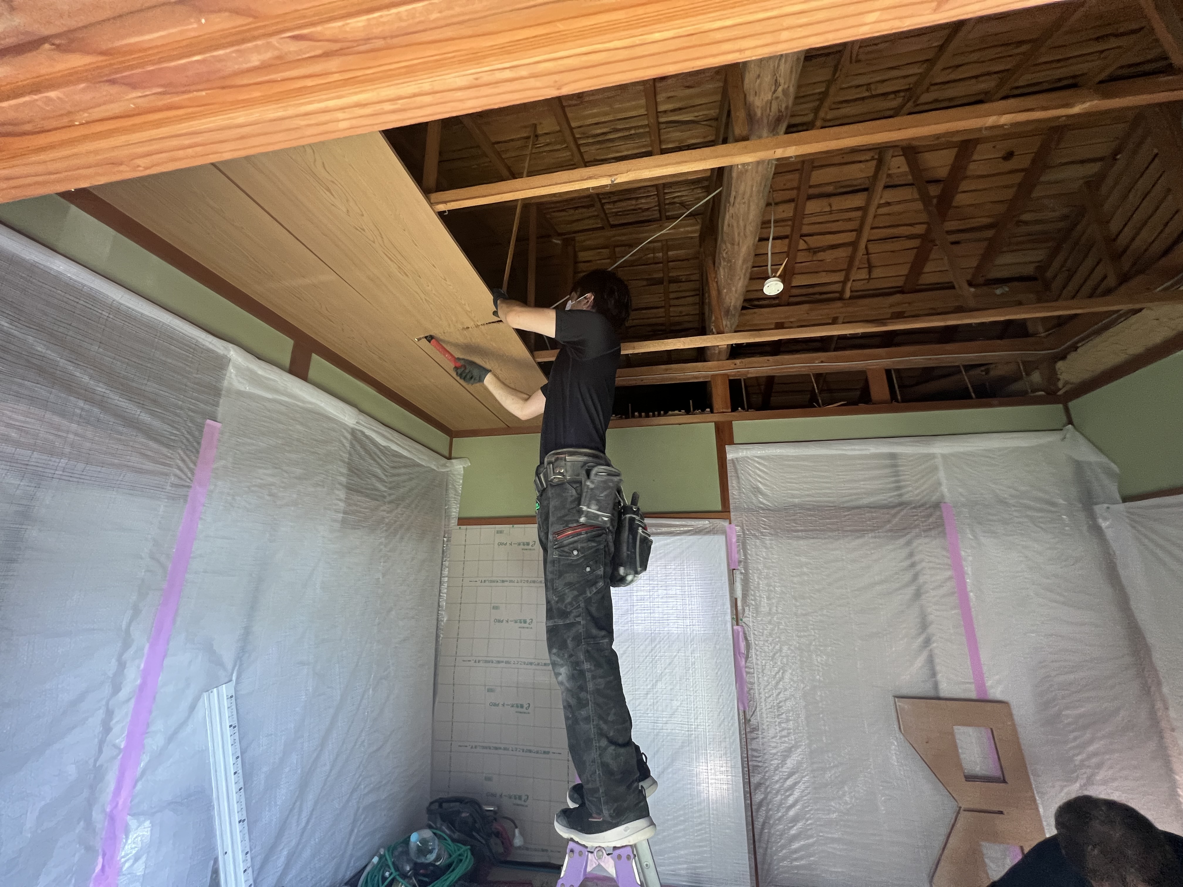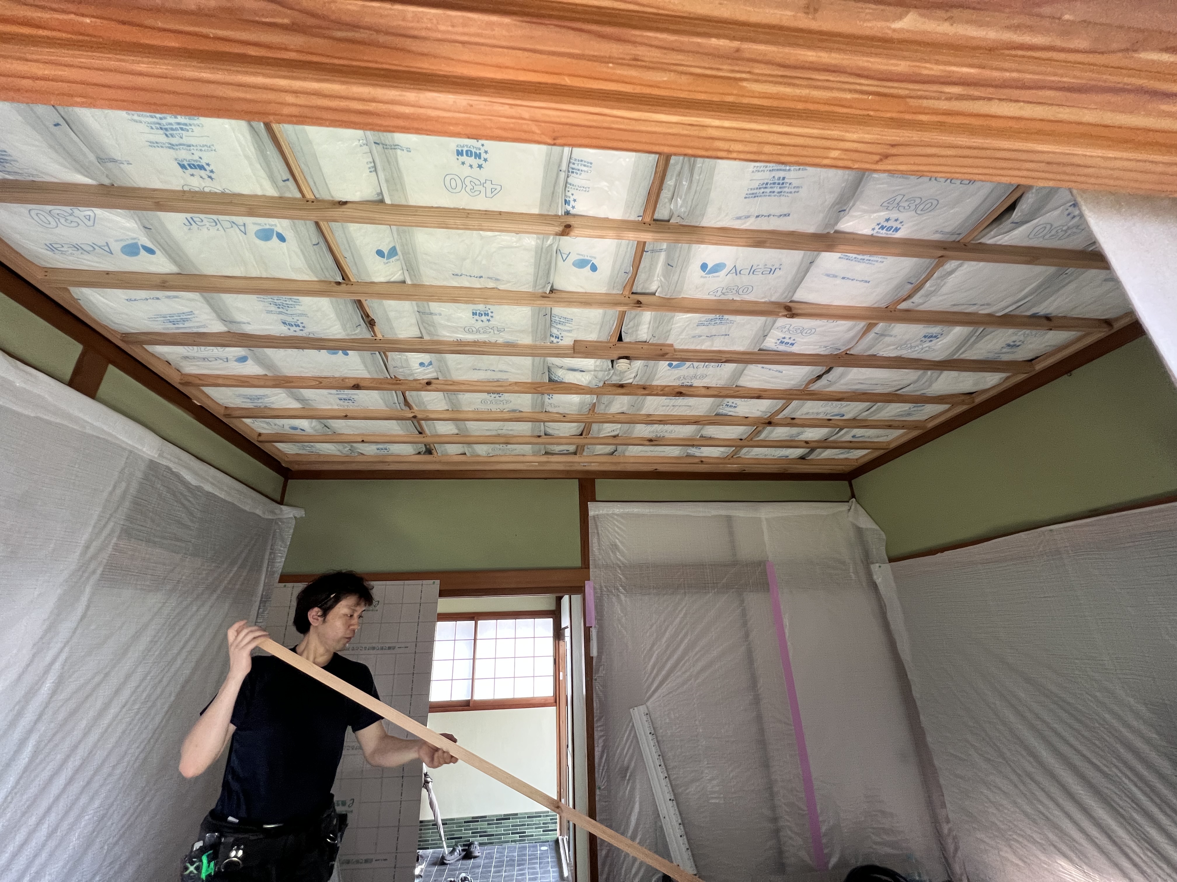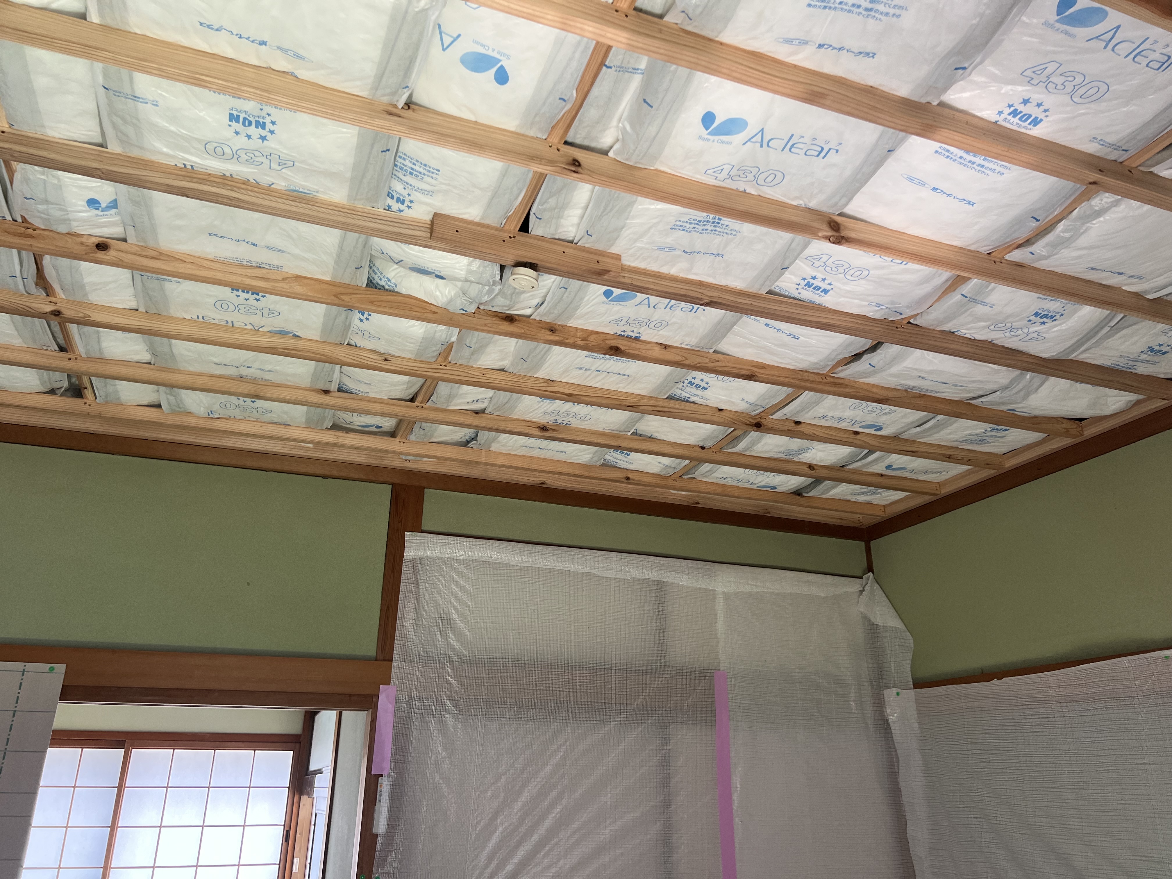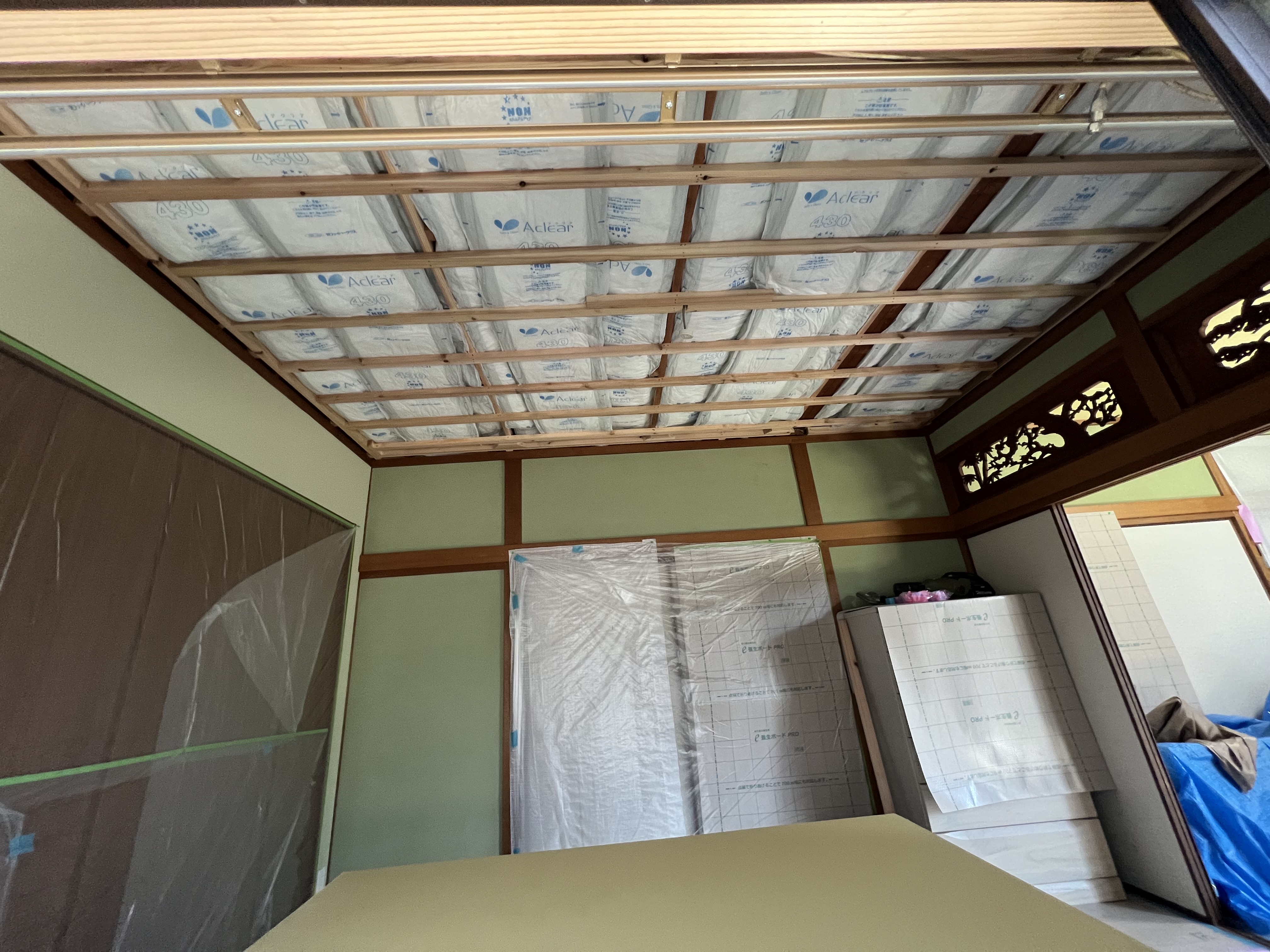 天井板を解体し、天井下地を補強し断熱材を敷き込んであげて石膏ボードを張り、クロスを張って仕上げました😁