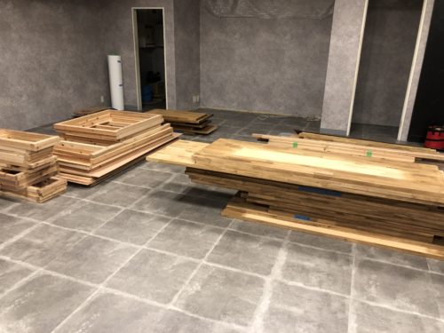 夜間作業2日目(^^)什器の製作を大工さんと2人で奮闘中!木製カウンターの仕様で反りや曲がりを考えながら試行錯…