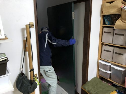 今日含め残り三日間(^^)本日は、室内建具の製作ドアが出来上がってきたので既存のドアと交換作業!外部はサンルー…